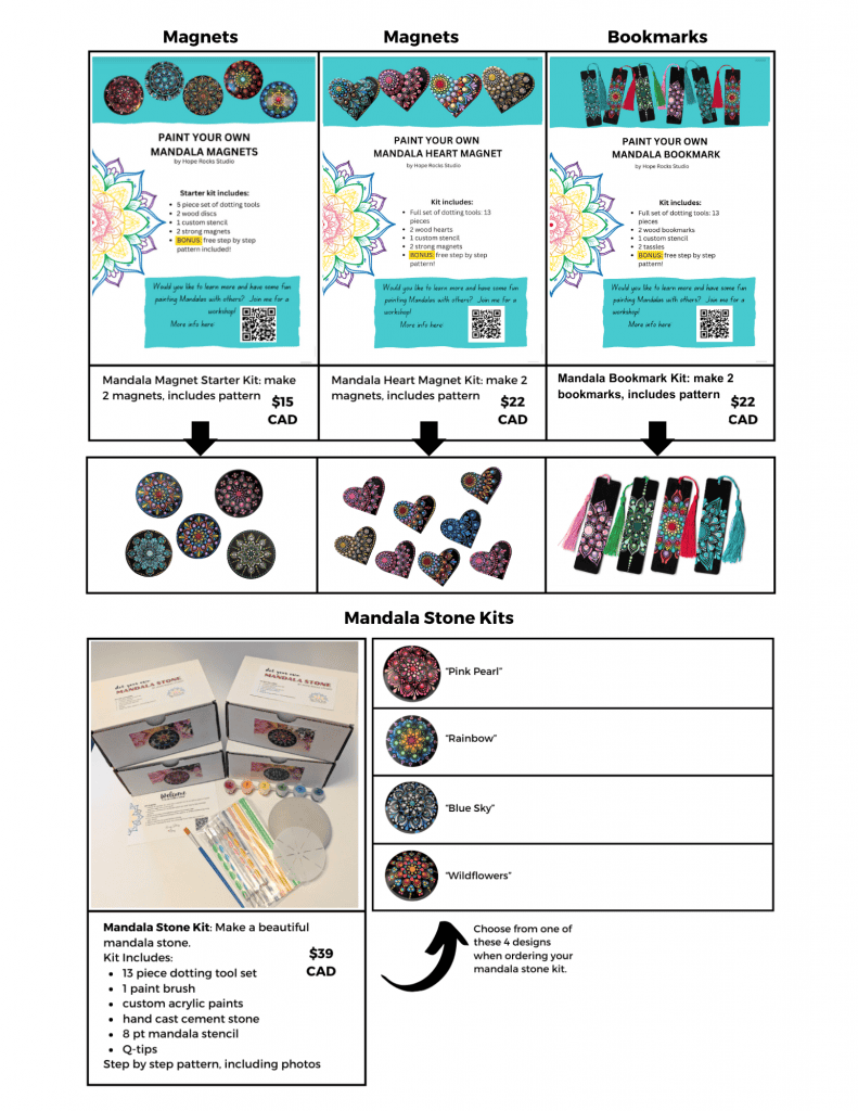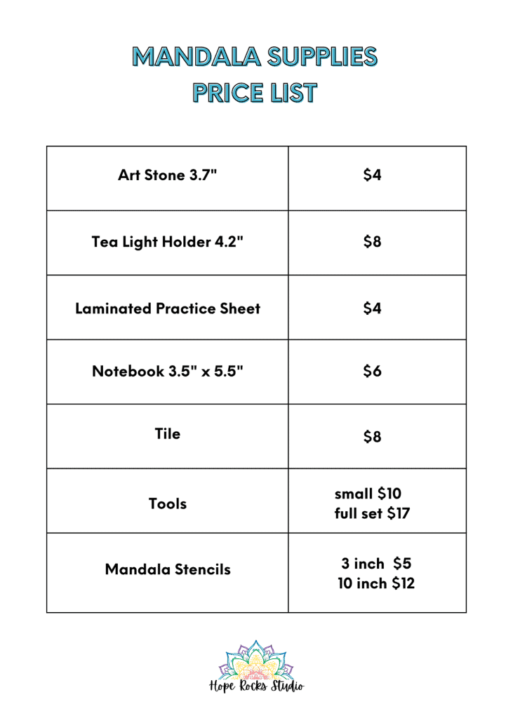 As my in-person workshops continue to grow, so does the demand for my mandala art supplies. At the workshops, I offer the following items for purchase. You can also purchase directly from me by sending me an email.
