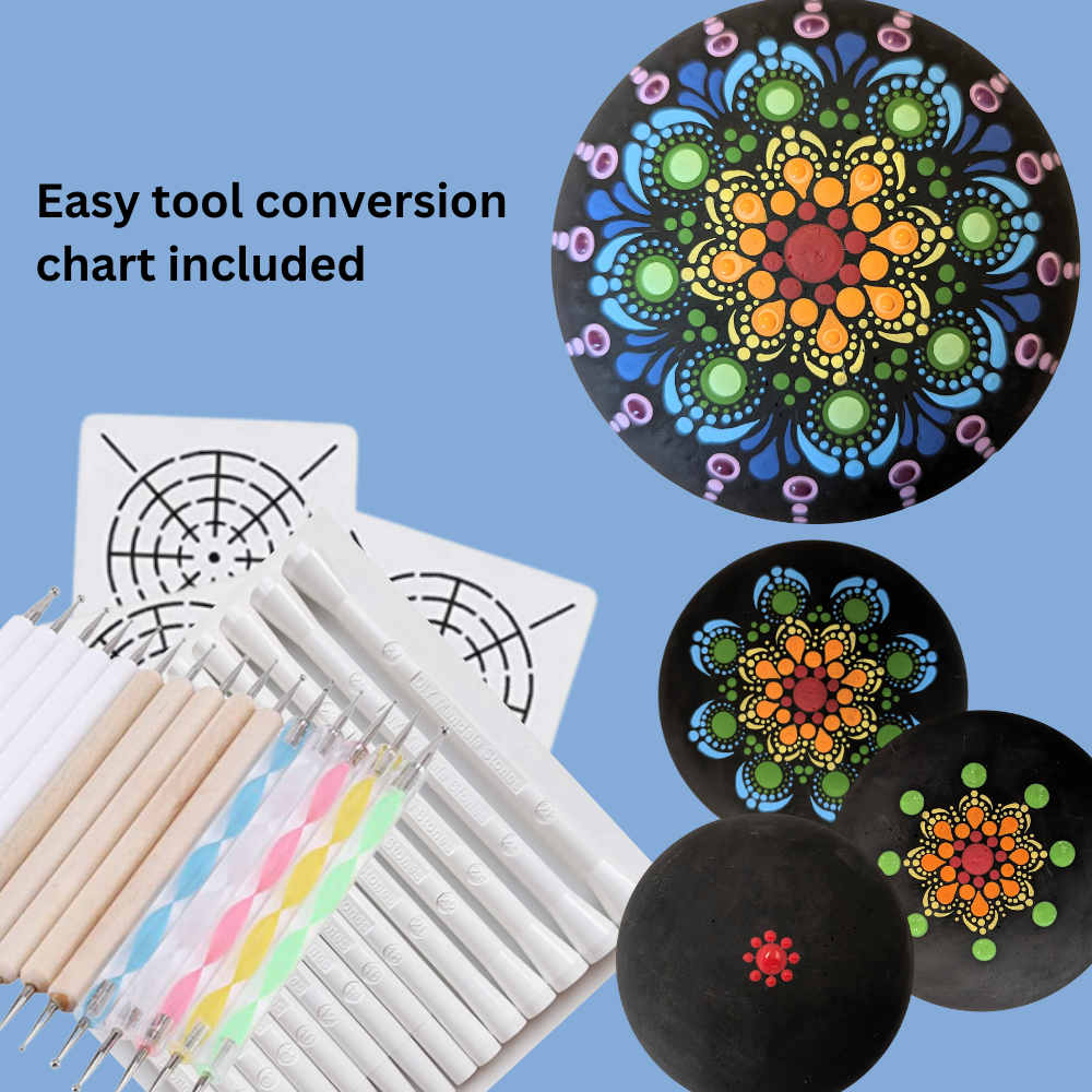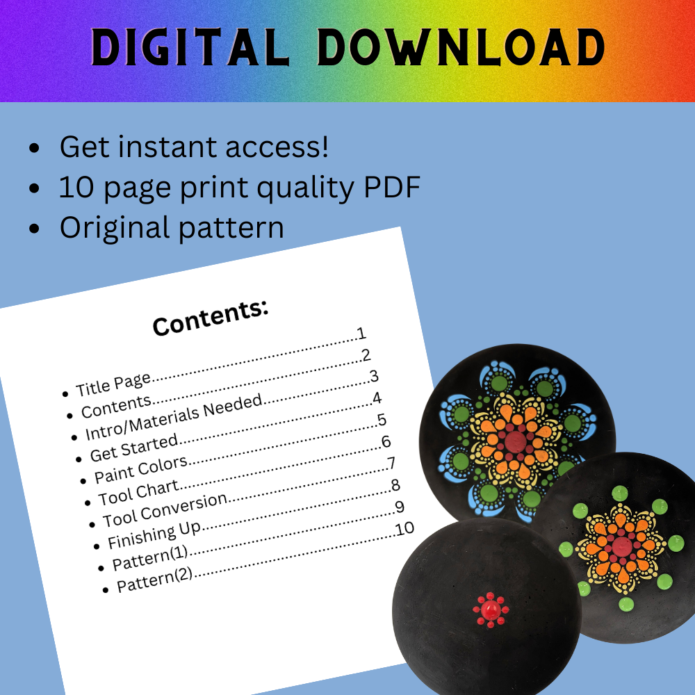 This RAINBOW mandala pattern was originally designed on a 3.8” art stone (Happy Dotting Company medium mould #2) and can be used on any surface of similar size – from stones to coasters, ornaments, or mini canvases.