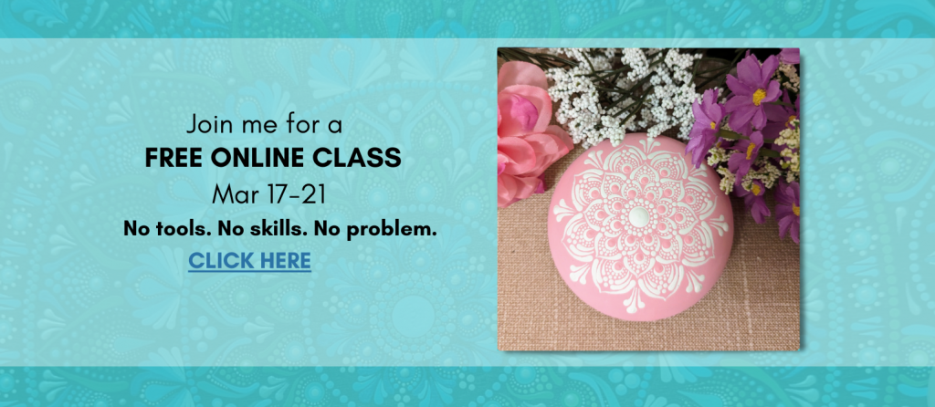 You’ll spend the first hour practicing and learning the techniques, and then you’ll move into about two hours of painting your own beautiful mandala stone—a piece you’ll feel proud to show off.